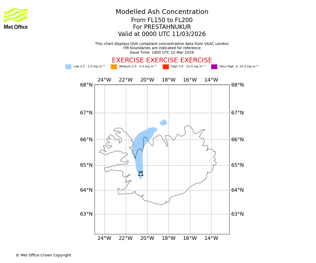Modelled ash concentration from 150 to 200 for PRESTAHNUKUR. Valid at 2100 UTC 10/03/2026