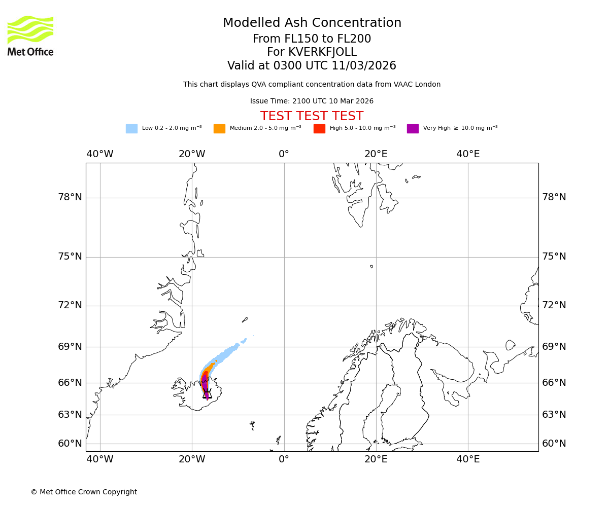 Modelled ash concentration from 150 to 200 for KVERKFJOLL. Valid at 0000 UTC 11/03/2026
