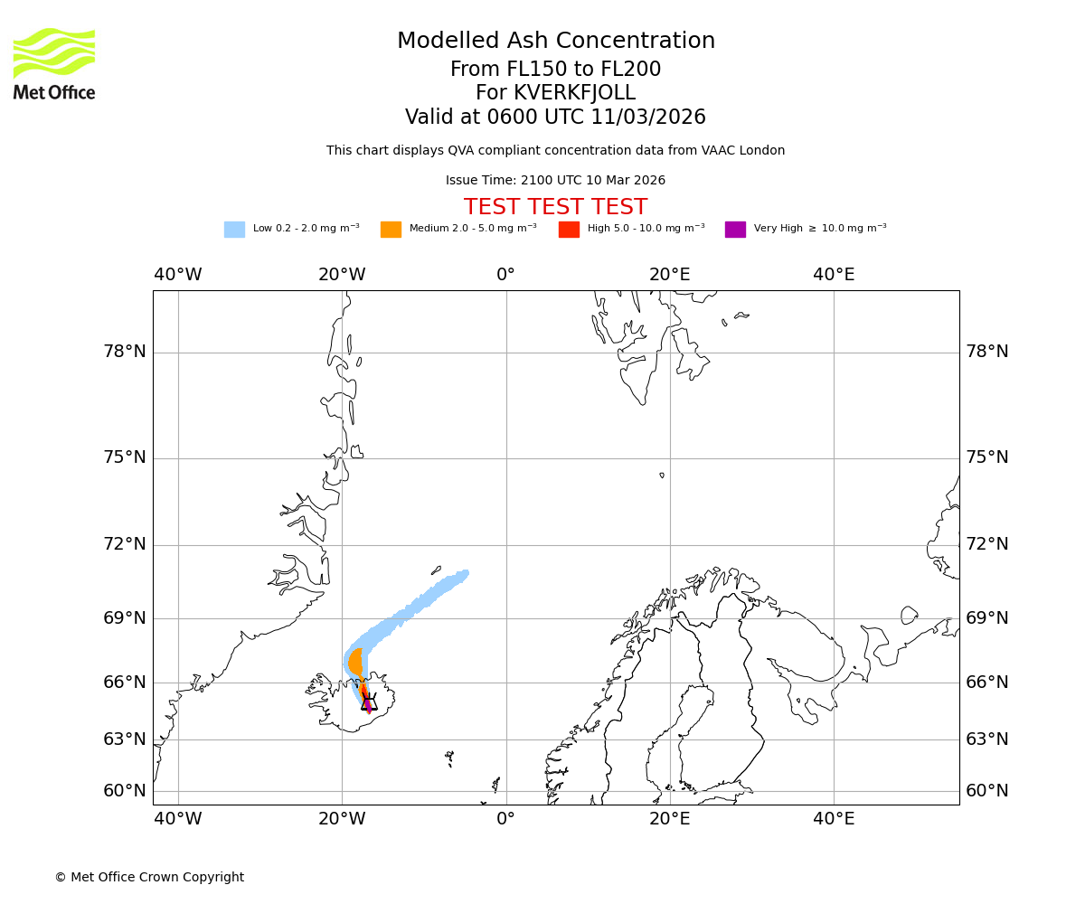 Modelled ash concentration from 150 to 200 for KVERKFJOLL. Valid at 0300 UTC 11/03/2026
