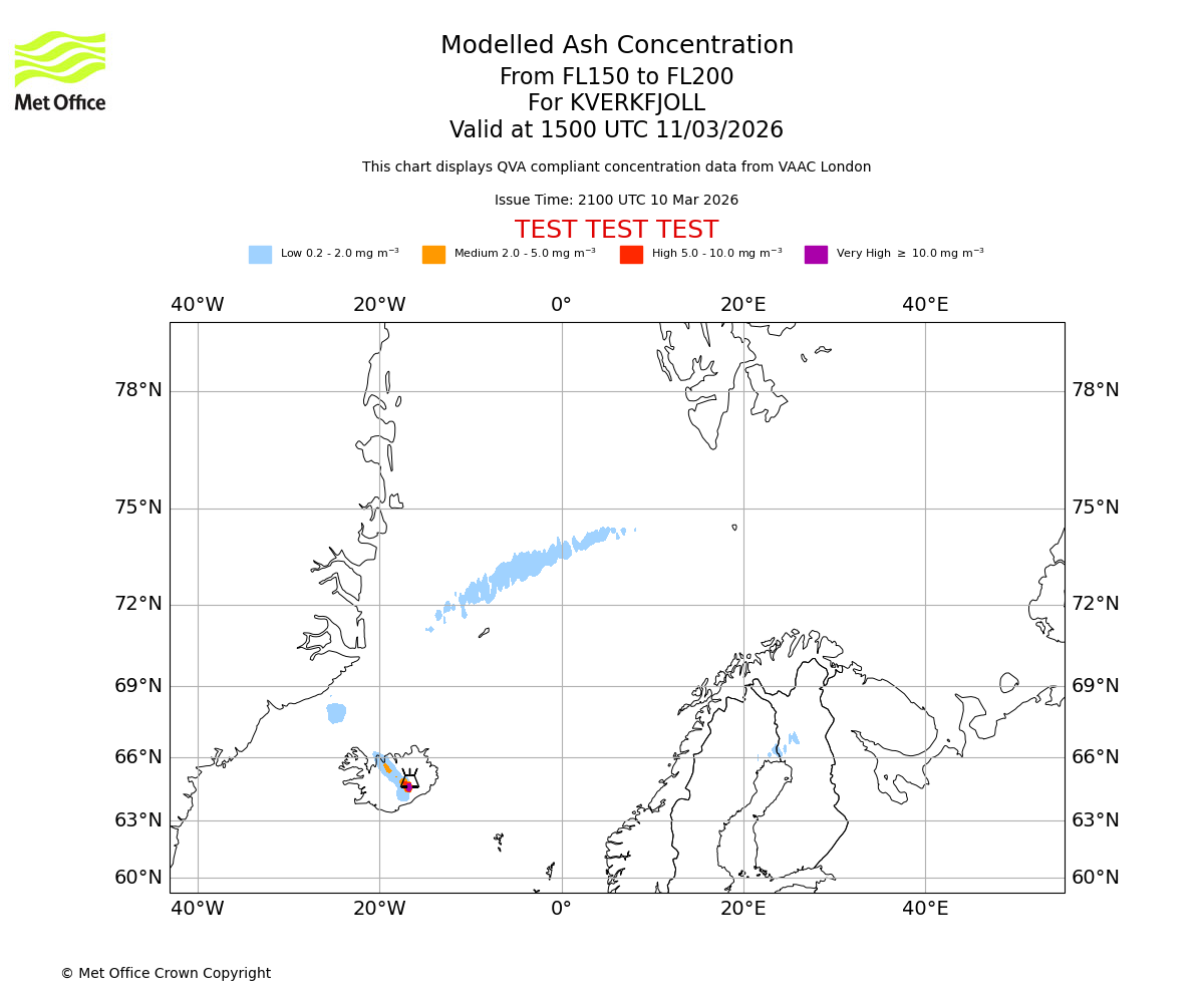 Modelled ash concentration from 150 to 200 for KVERKFJOLL. Valid at 1200 UTC 11/03/2026