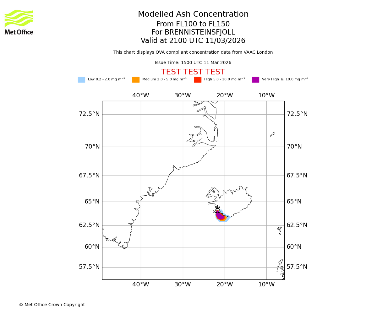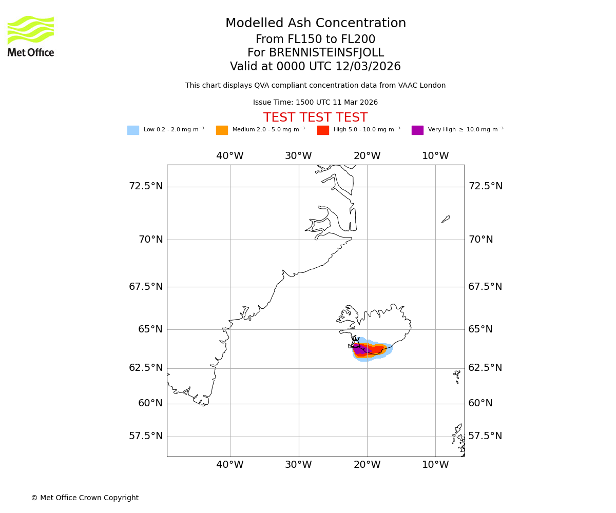 Modelled ash concentration from 150 to 200 for BRENNISTEINSFJOLL. Valid at 2100 UTC 11/03/2026