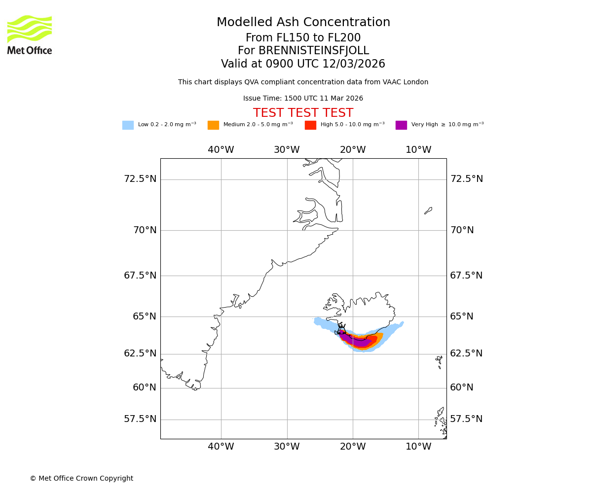 Modelled ash concentration from 000 to 200 for BRENNISTEINSFJOLL. Valid at 1500 UTC 11/03/2026