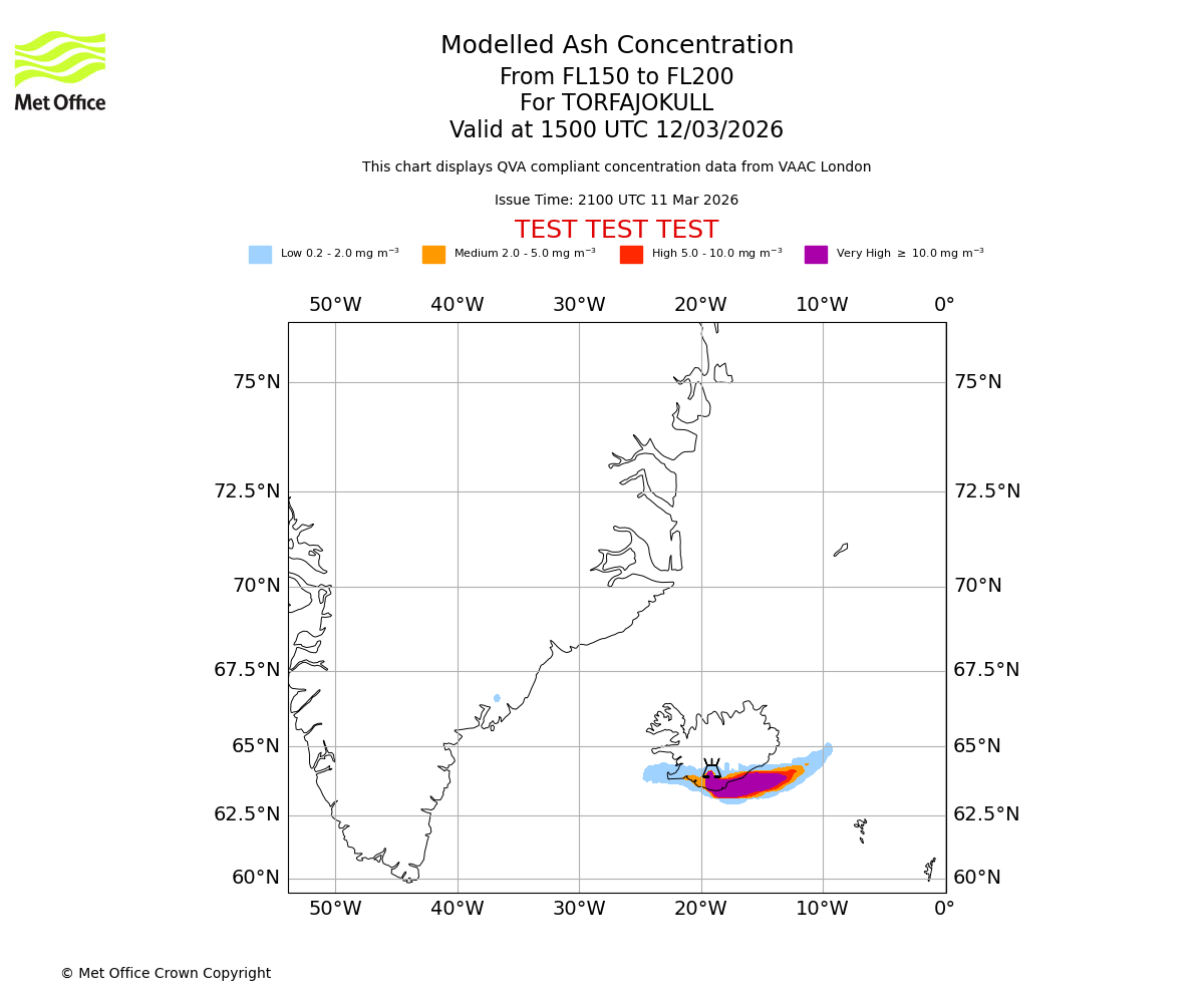 Modelled ash concentration from 150 to 200 for TORFAJOKULL. Valid at 1200 UTC 12/03/2026