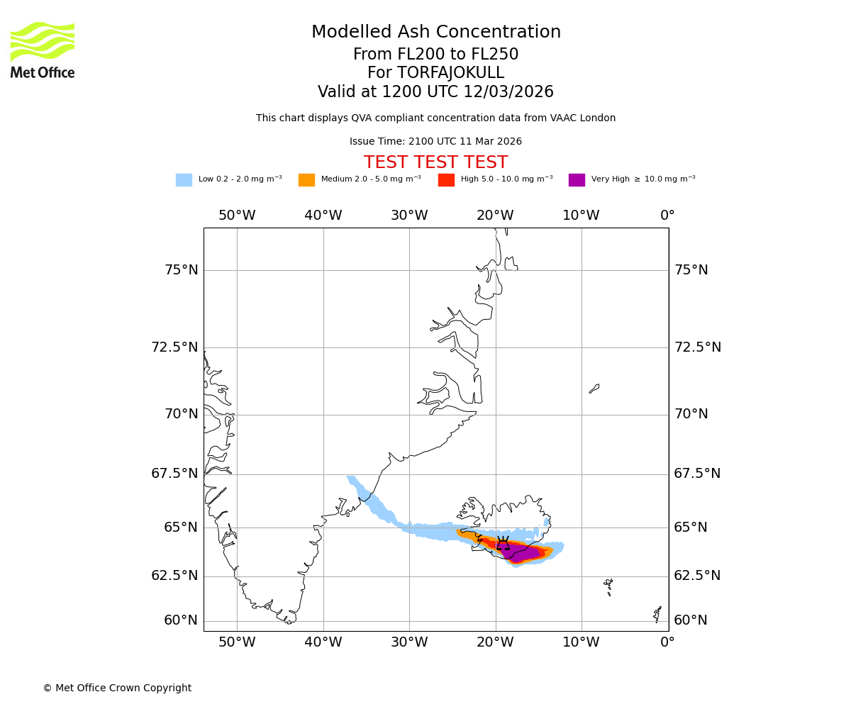 Modelled ash concentration from 000 to 200 for TORFAJOKULL. Valid at 2100 UTC 11/03/2026