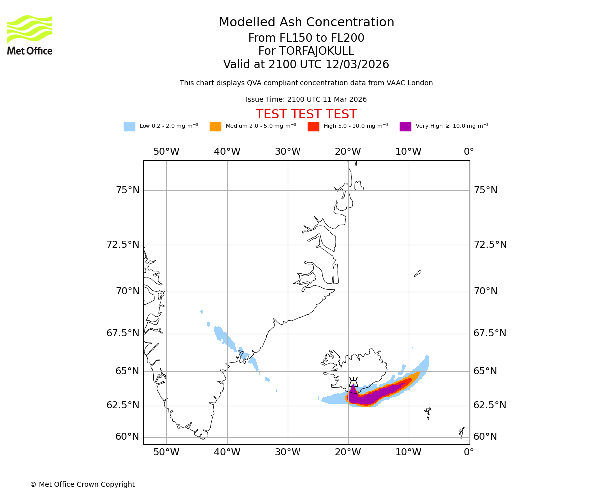 Modelled ash concentration from 150 to 200 for TORFAJOKULL. Valid at 1800 UTC 12/03/2026