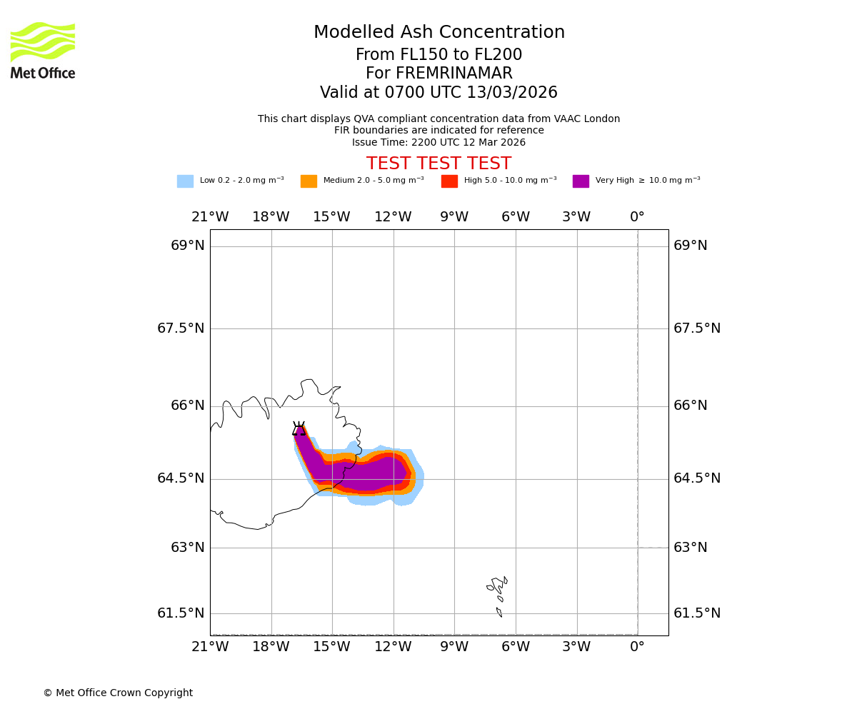 Modelled ash concentration from 000 to 200 for FREMRINAMAR. Valid at 2200 UTC 12/03/2026