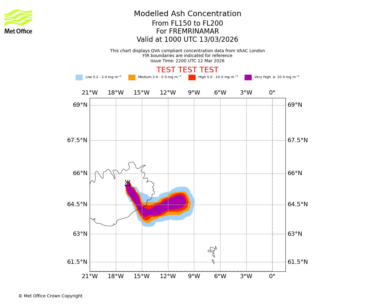 Modelled ash concentration from 000 to 200 for FREMRINAMAR. Valid at 2200 UTC 12/03/2026
