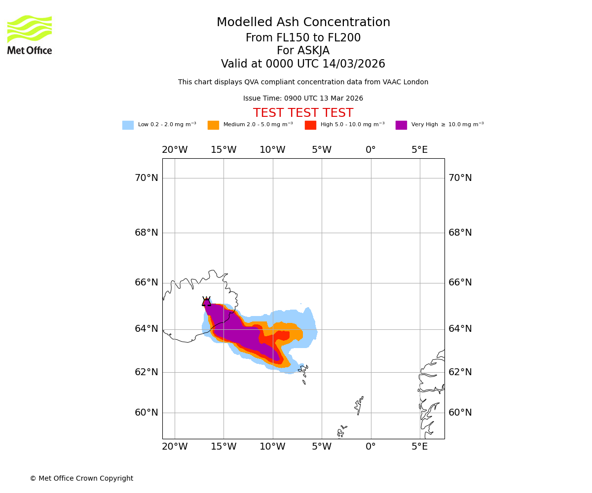 Modelled ash concentration from 150 to 200 for ASKJA. Valid at 2100 UTC 13/03/2026
