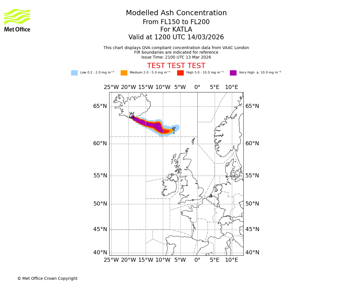 Modelled ash concentration from 150 to 200 for KATLA. Valid at 0900 UTC 14/03/2026