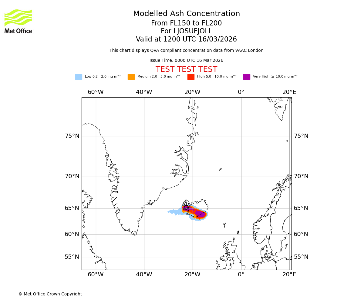 Modelled ash concentration from 150 to 200 for LJOSUFJOLL. Valid at 0900 UTC 16/03/2026