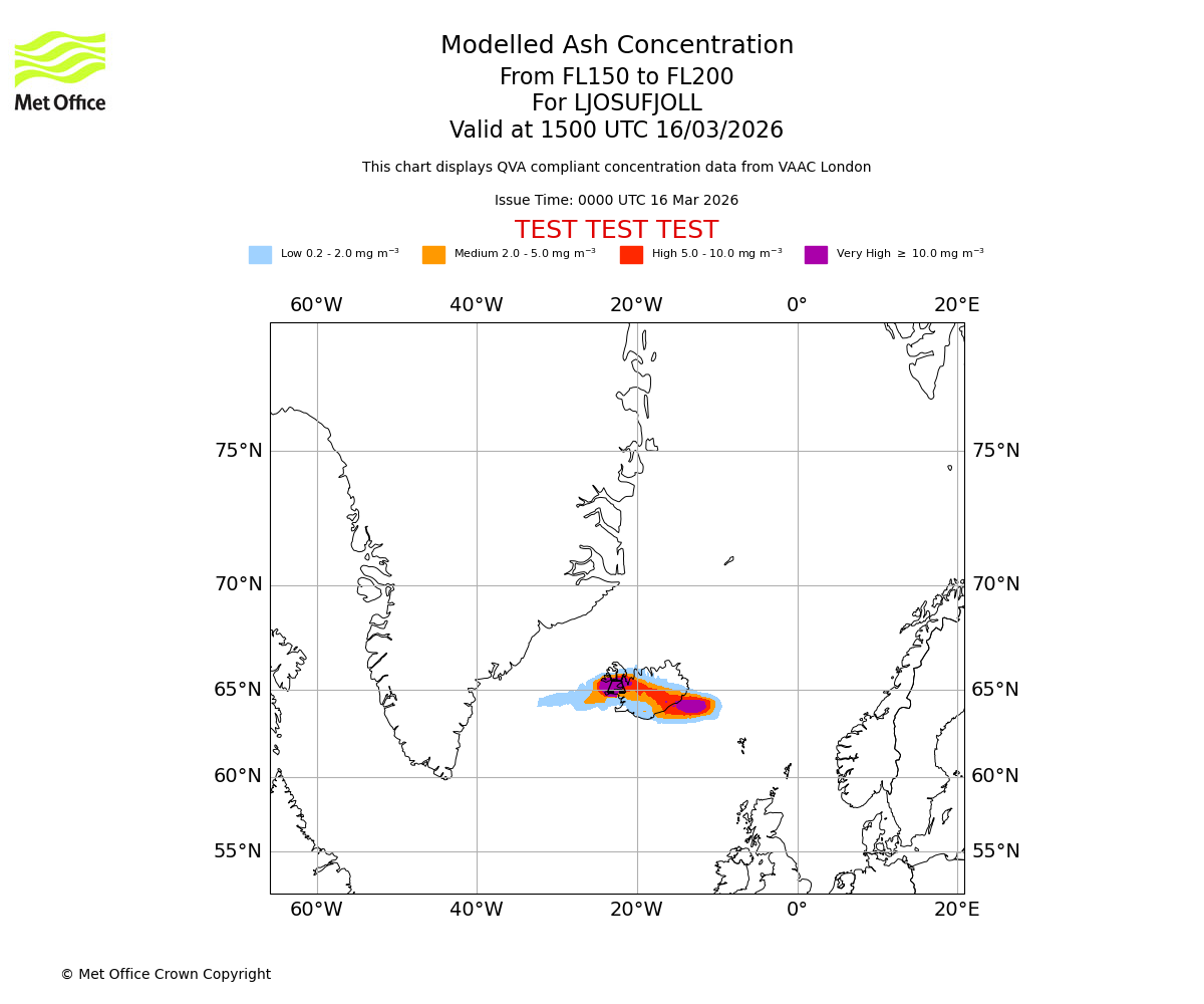 Modelled ash concentration from 150 to 200 for LJOSUFJOLL. Valid at 1200 UTC 16/03/2026