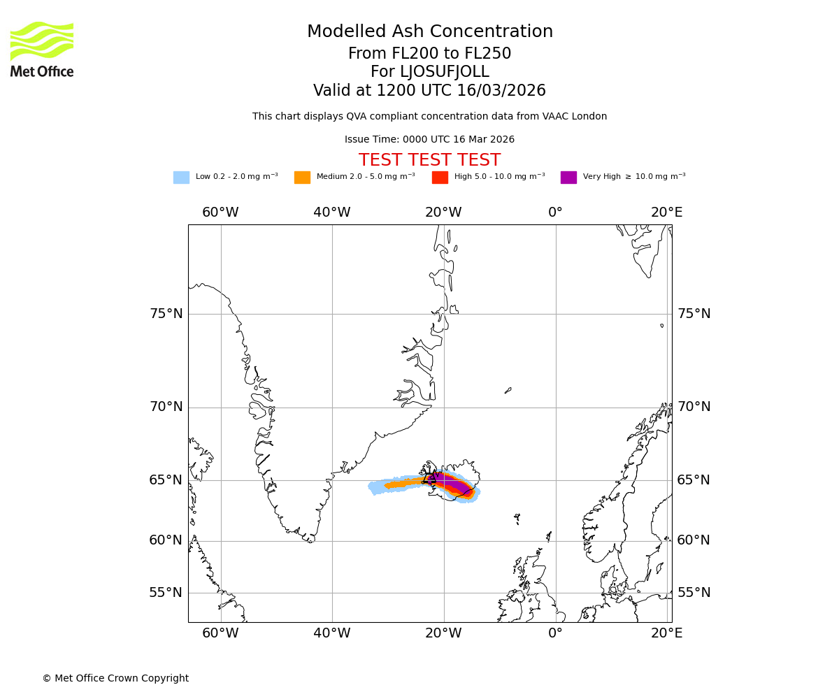 Modelled ash concentration from 000 to 200 for LJOSUFJOLL. Valid at 0000 UTC 16/03/2026