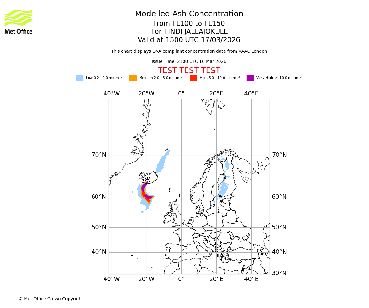 Modelled ash concentration from 000 to 200 for TINDFJALLAJOKULL. Valid at 2100 UTC 16/03/2026