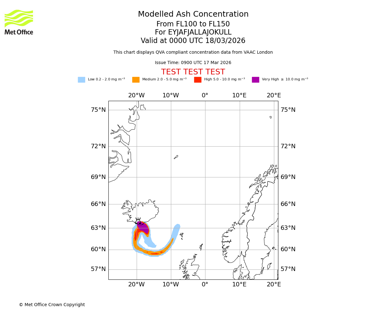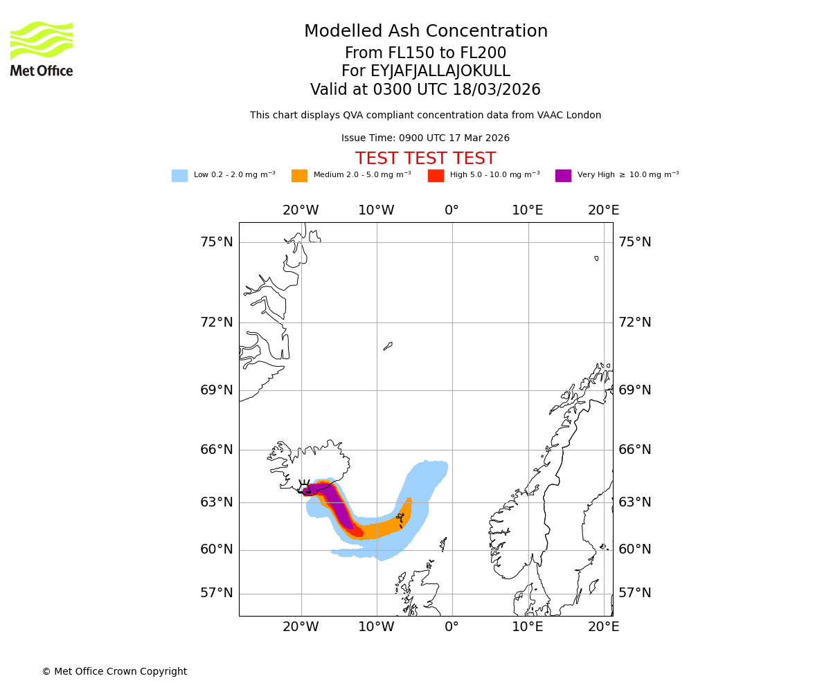 Modelled ash concentration from 150 to 200 for EYJAFJALLAJOKULL. Valid at 0000 UTC 18/03/2026