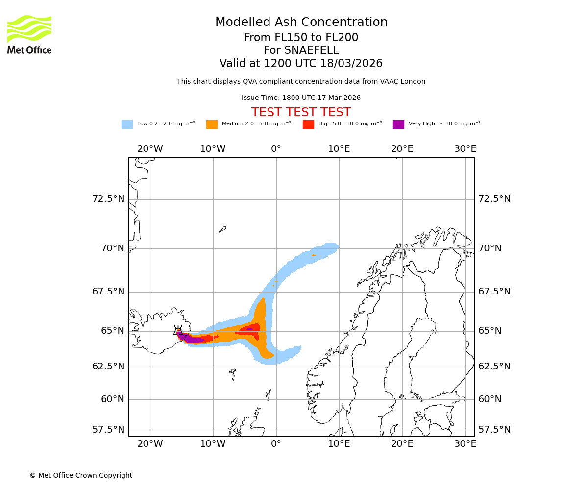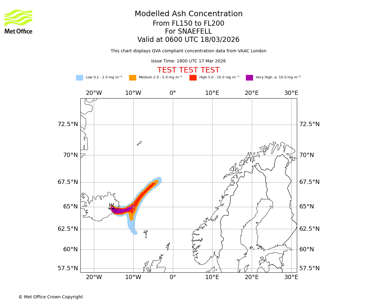 Modelled ash concentration from 150 to 200 for SNAEFELL. Valid at 0900 UTC 18/03/2026