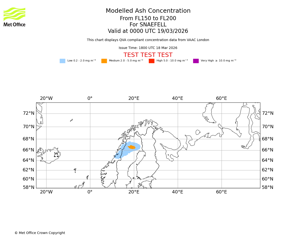 Modelled ash concentration from 150 to 200 for SNAEFELL. Valid at 2100 UTC 18/03/2026