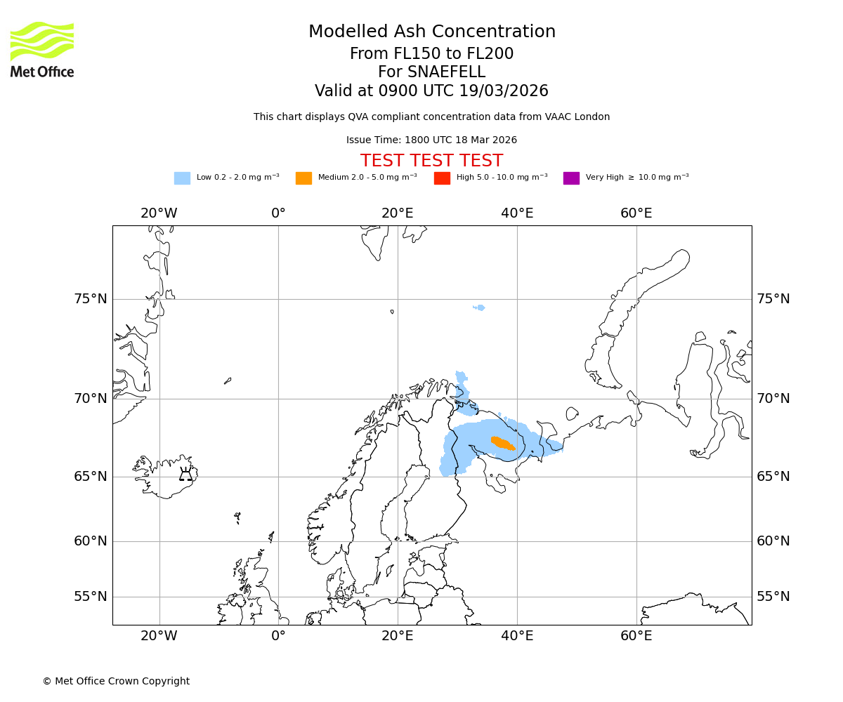 Modelled ash concentration from 150 to 200 for SNAEFELL. Valid at 0600 UTC 19/03/2026