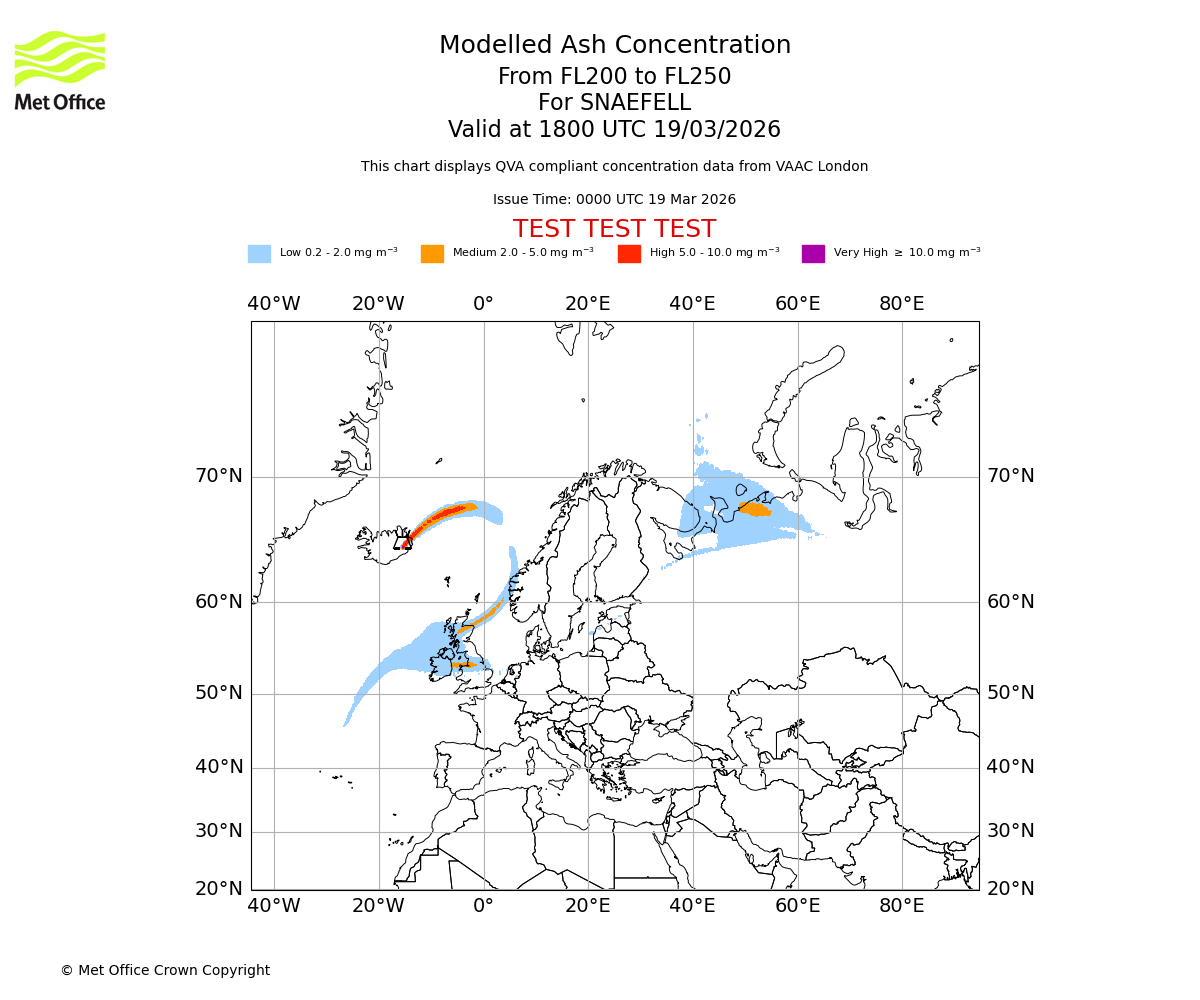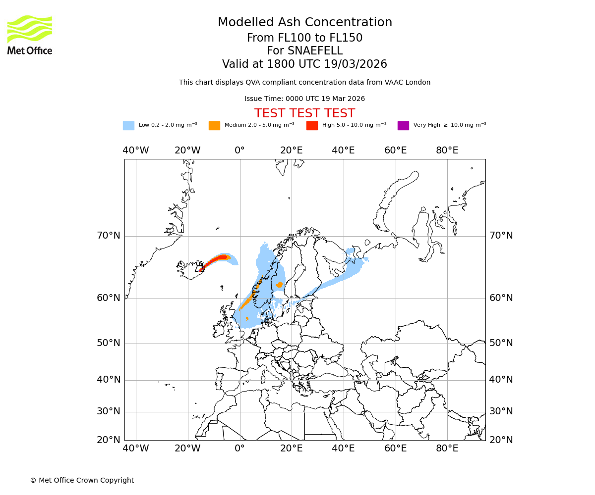 Modelled ash concentration from 150 to 200 for SNAEFELL. Valid at 1800 UTC 19/03/2026