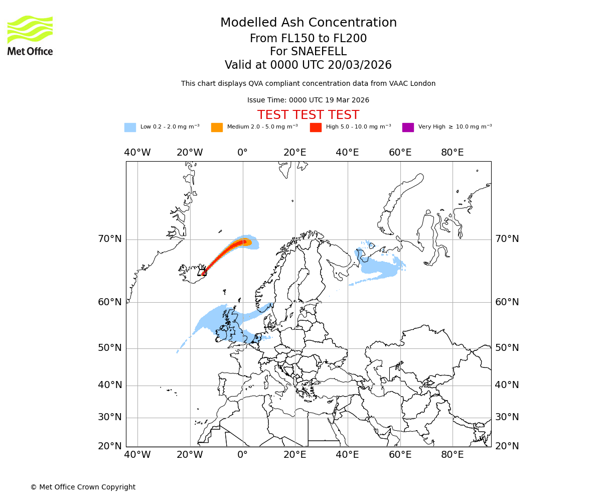 Modelled ash concentration from 150 to 200 for SNAEFELL. Valid at 2100 UTC 19/03/2026