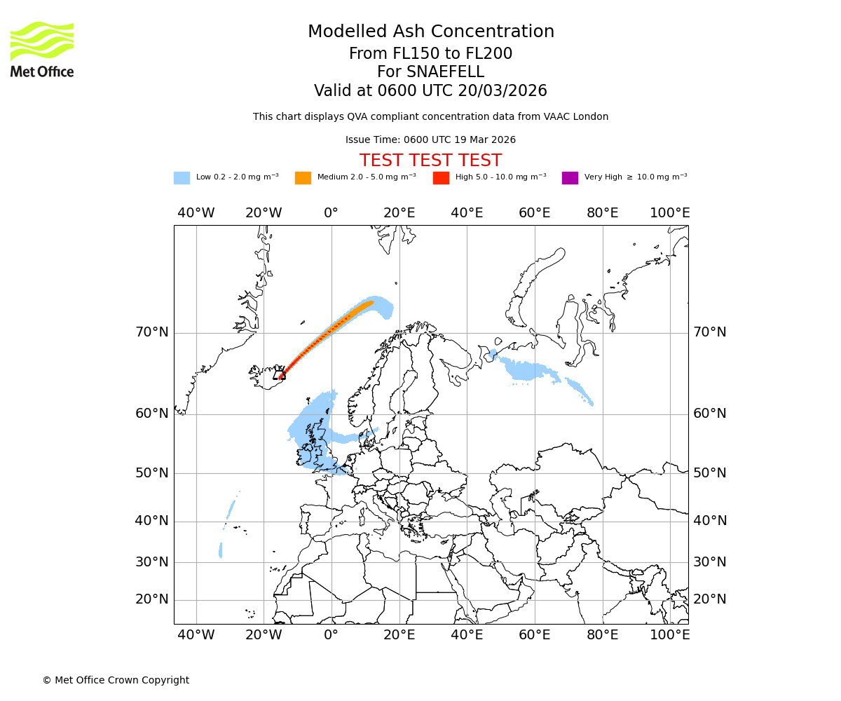 Modelled ash concentration from 150 to 200 for SNAEFELL. Valid at 0300 UTC 20/03/2026