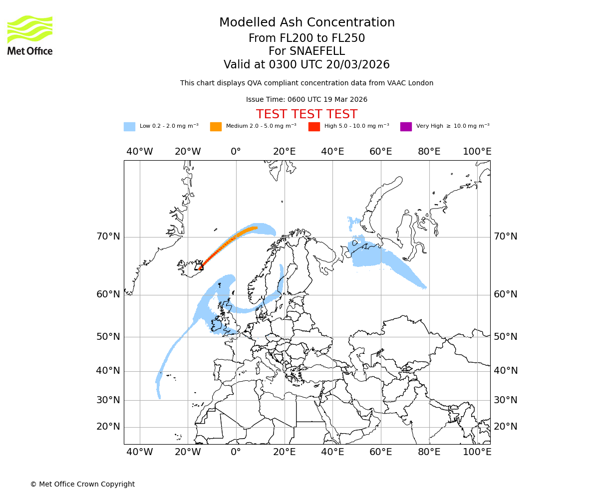 Modelled ash concentration from 000 to 200 for SNAEFELL. Valid at 0600 UTC 19/03/2026