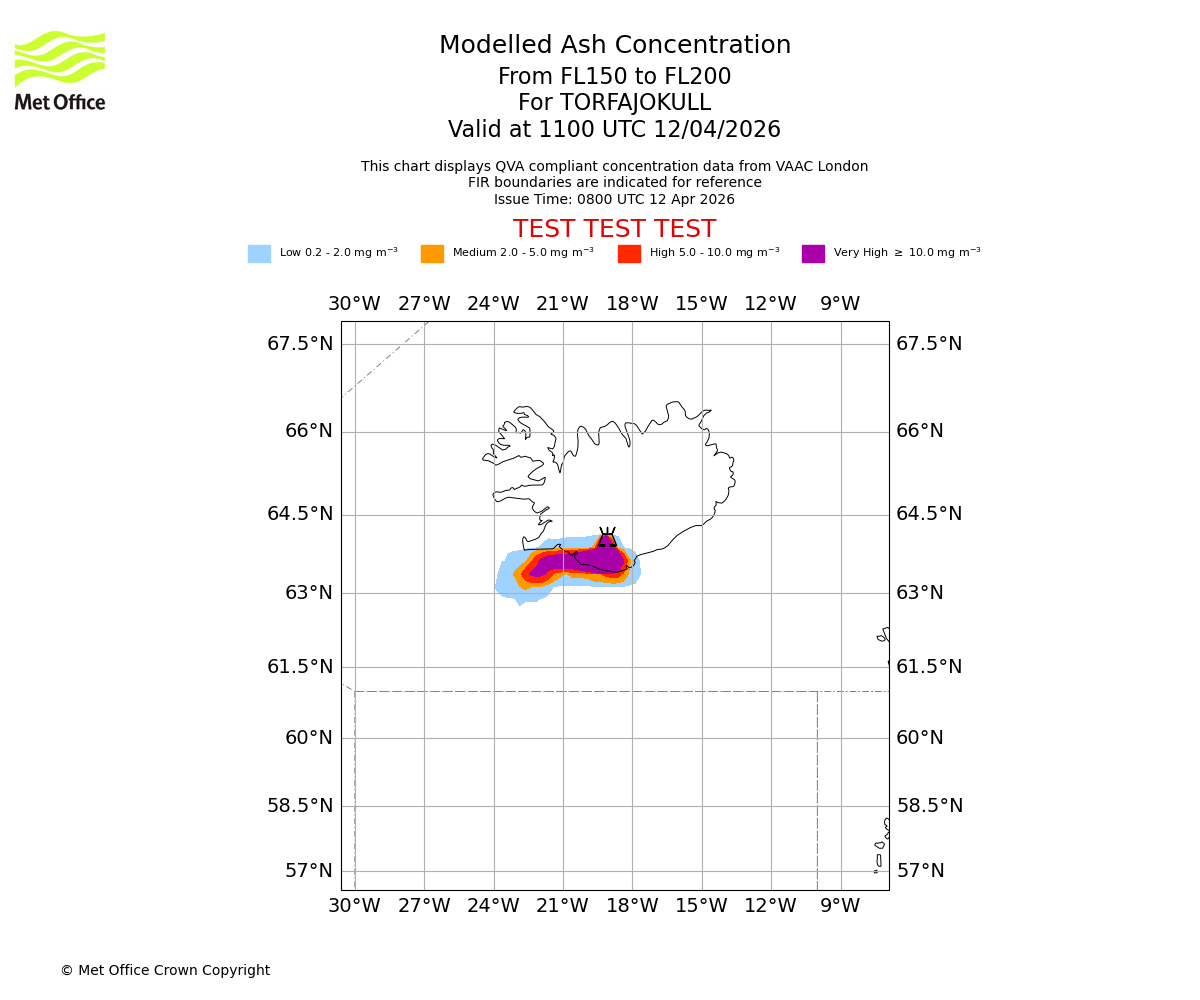 Modelled ash concentration from 150 to 200 for TORFAJOKULL. Valid at 0800 UTC 12/04/2026