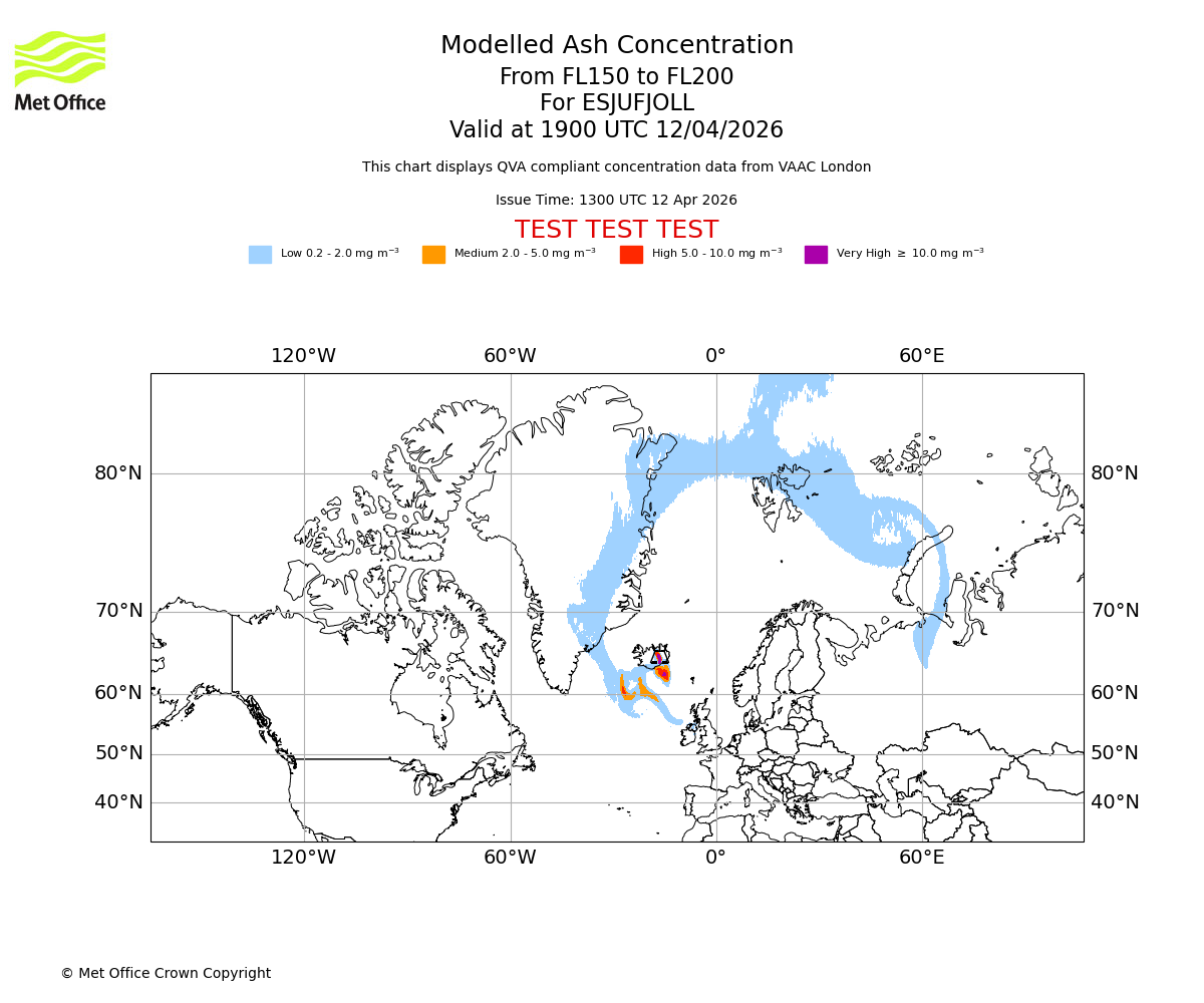 Modelled ash concentration from 150 to 200 for ESJUFJOLL. Valid at 1600 UTC 12/04/2026