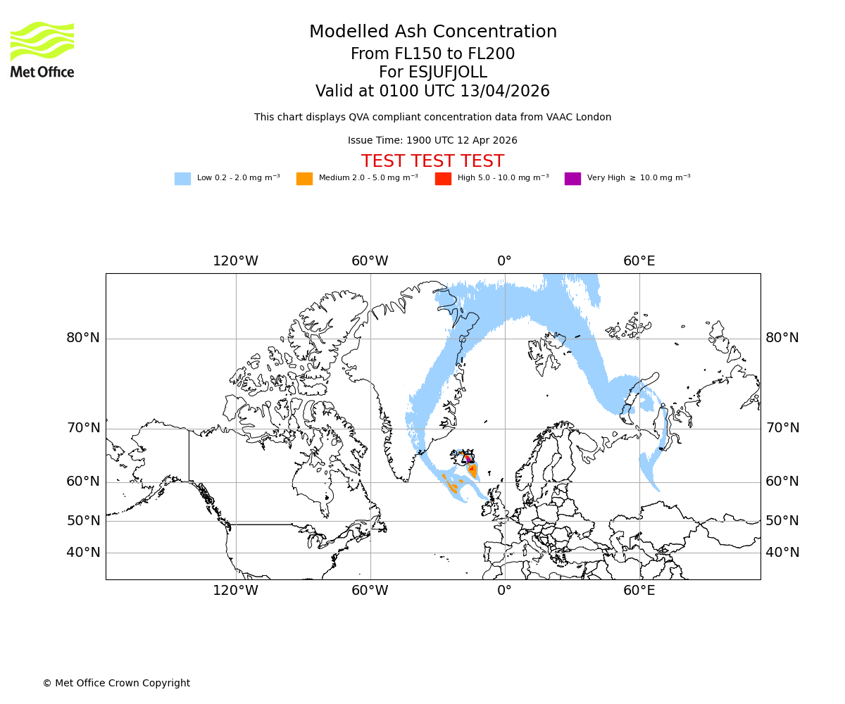 Modelled ash concentration from 150 to 200 for ESJUFJOLL. Valid at 2200 UTC 12/04/2026