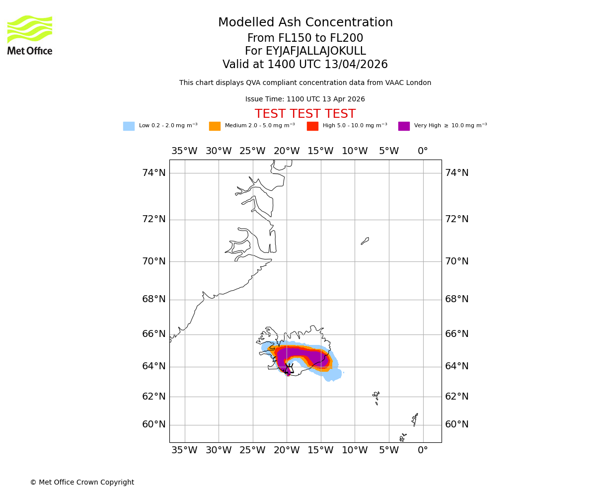 Modelled ash concentration from 150 to 200 for EYJAFJALLAJOKULL. Valid at 1100 UTC 13/04/2026