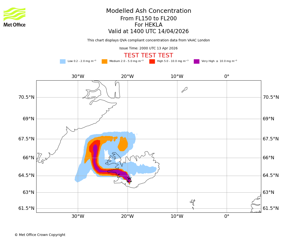 Modelled ash concentration from 150 to 200 for HEKLA. Valid at 1100 UTC 14/04/2026