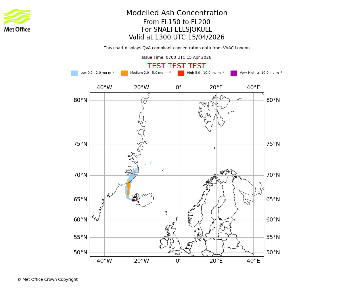 Modelled ash concentration from 150 to 200 for SNAEFELLSJOKULL. Valid at 1000 UTC 15/04/2026