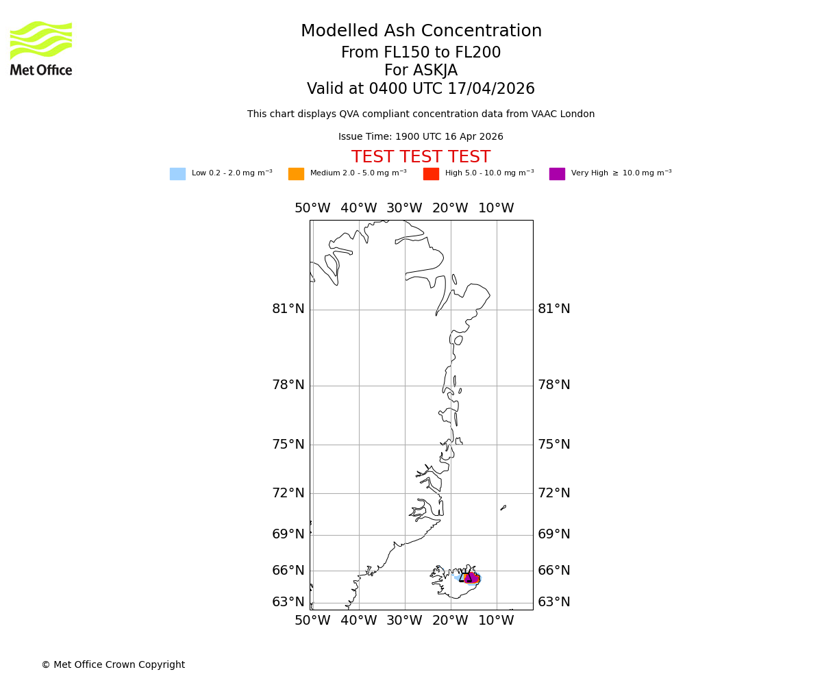 Modelled ash concentration from 000 to 200 for ASKJA. Valid at 1900 UTC 16/04/2026
