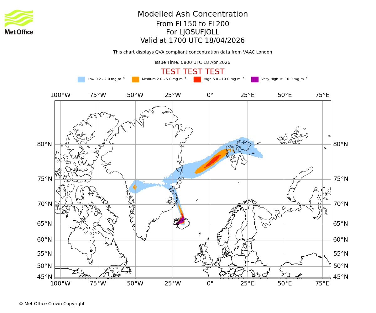 Modelled ash concentration from 150 to 200 for LJOSUFJOLL. Valid at 1400 UTC 18/04/2026