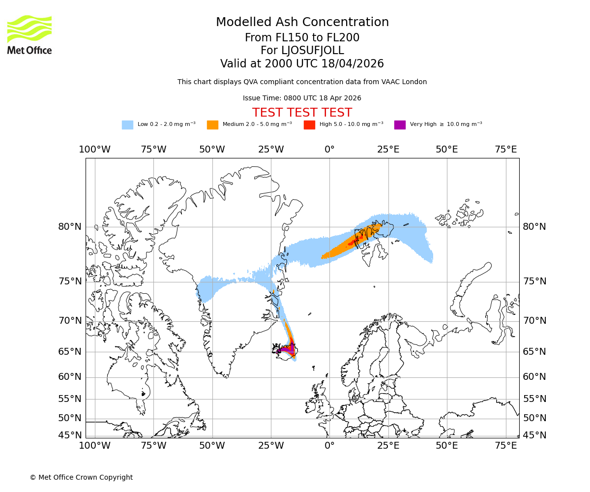 Modelled ash concentration from 000 to 200 for LJOSUFJOLL. Valid at 0800 UTC 18/04/2026