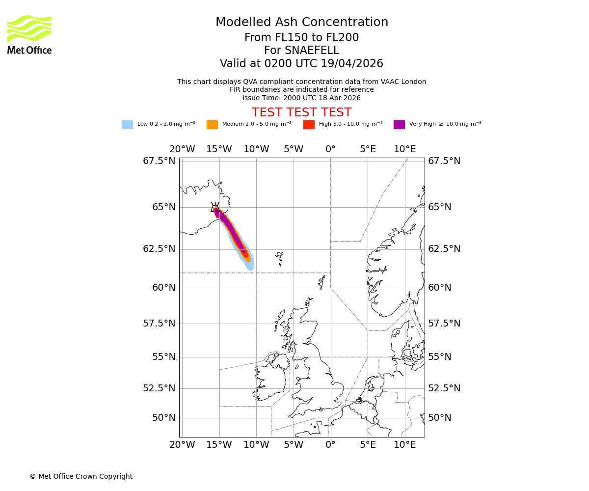 Modelled ash concentration from 150 to 200 for SNAEFELL. Valid at 2300 UTC 18/04/2026
