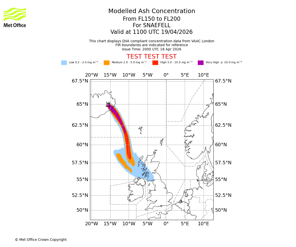 Modelled ash concentration from 150 to 200 for SNAEFELL. Valid at 0800 UTC 19/04/2026