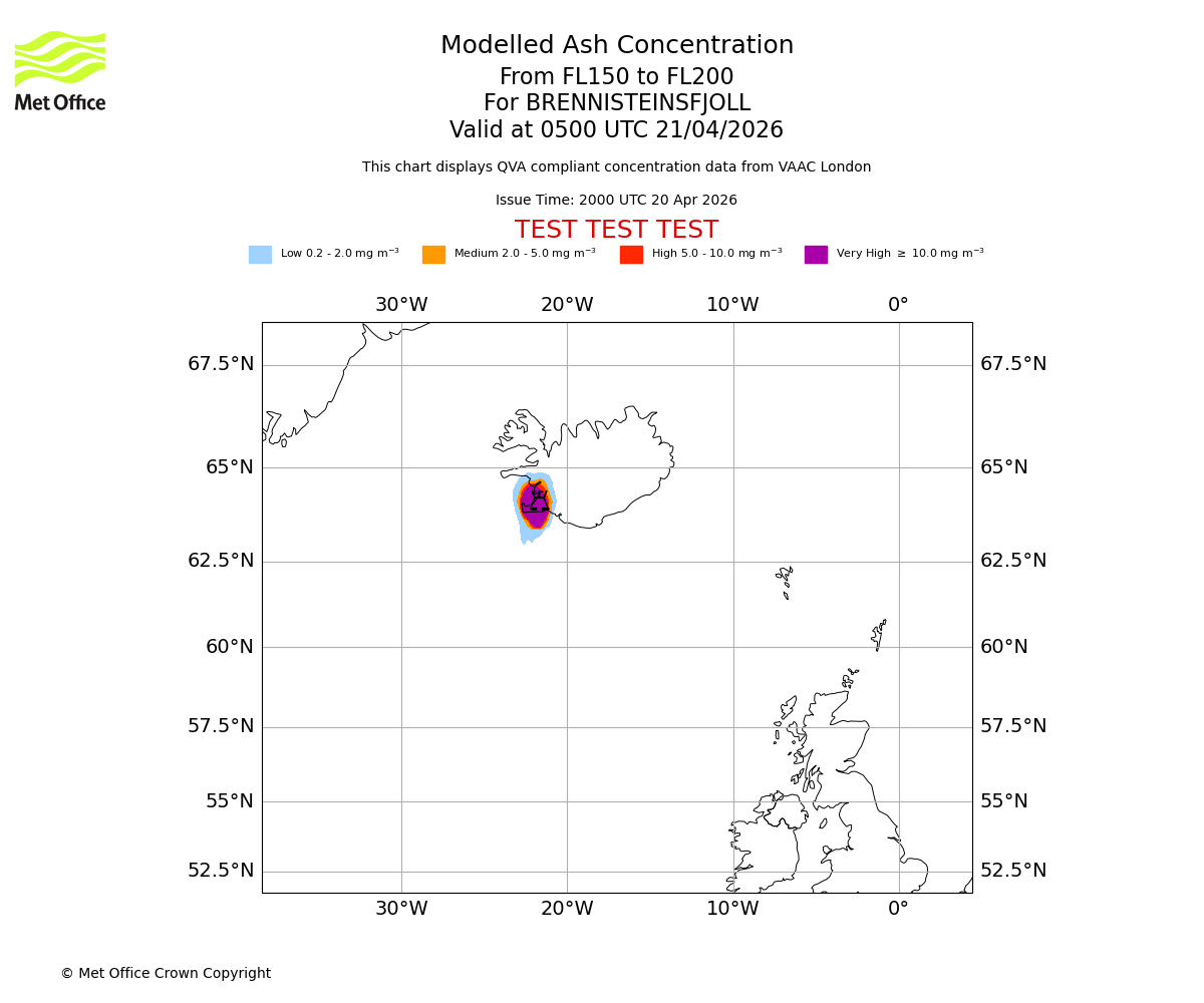 Modelled ash concentration from 150 to 200 for BRENNISTEINSFJOLL. Valid at 0200 UTC 21/04/2026