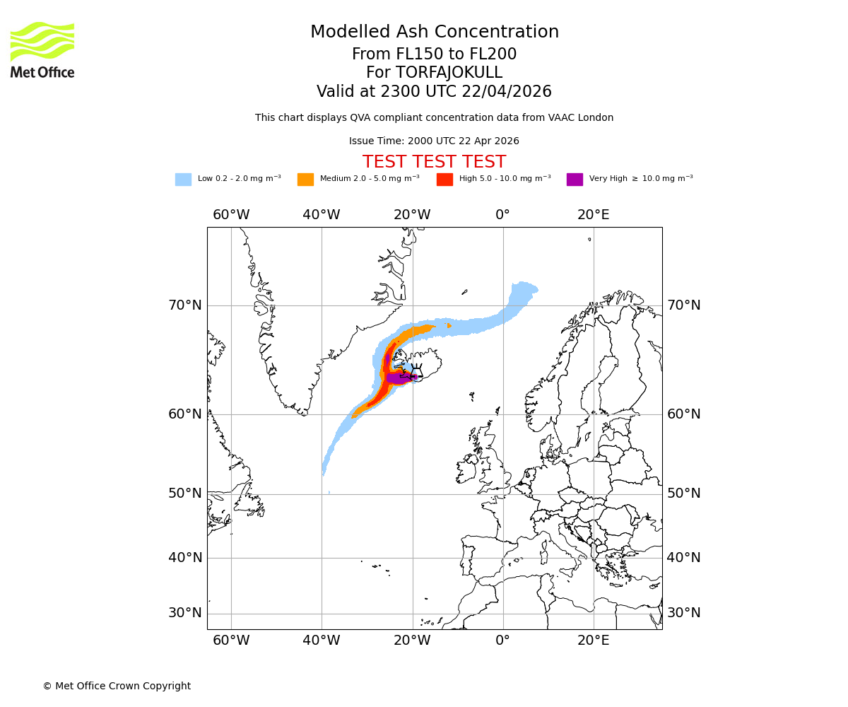 Modelled ash concentration from 150 to 200 for TORFAJOKULL. Valid at 2000 UTC 22/04/2026