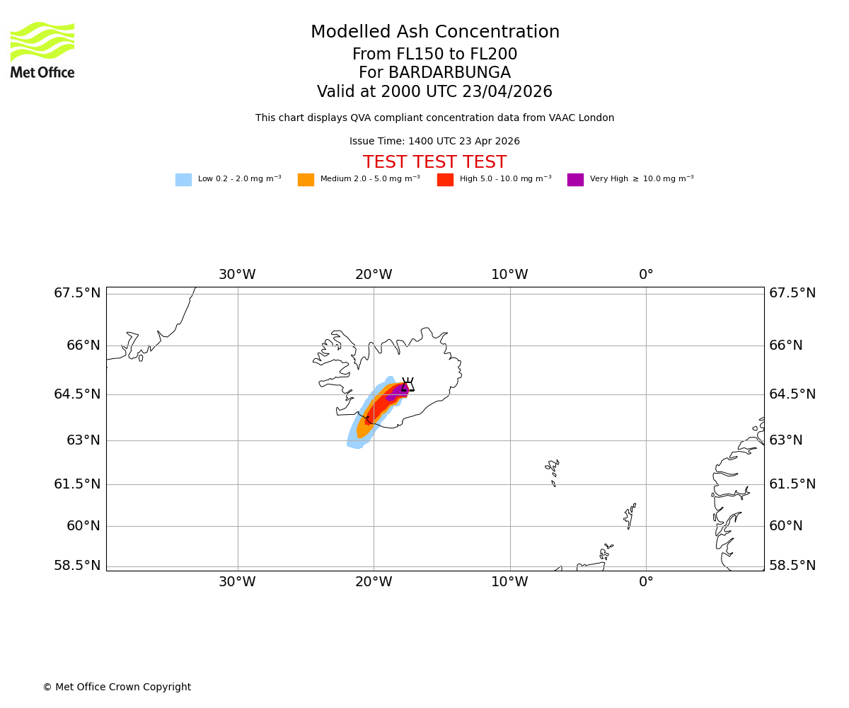 Modelled ash concentration from 000 to 200 for BARDARBUNGA. Valid at 1400 UTC 23/04/2026
