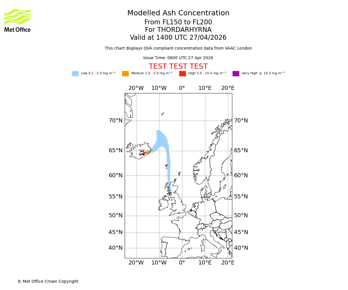 Modelled ash concentration from 150 to 200 for THORDARHYRNA. Valid at 1100 UTC 27/04/2026