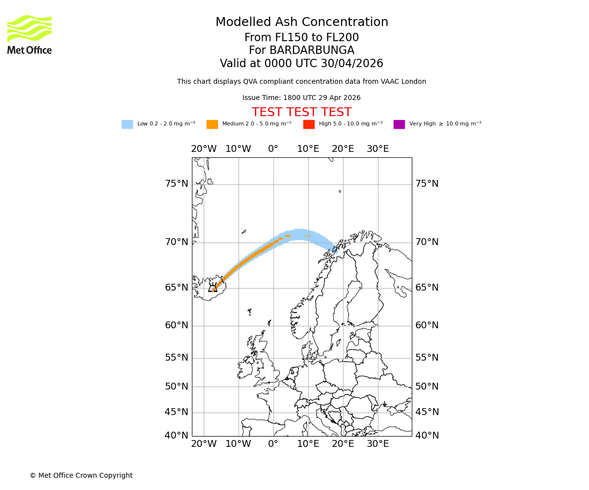Modelled ash concentration from 150 to 200 for BARDARBUNGA. Valid at 2100 UTC 29/04/2026