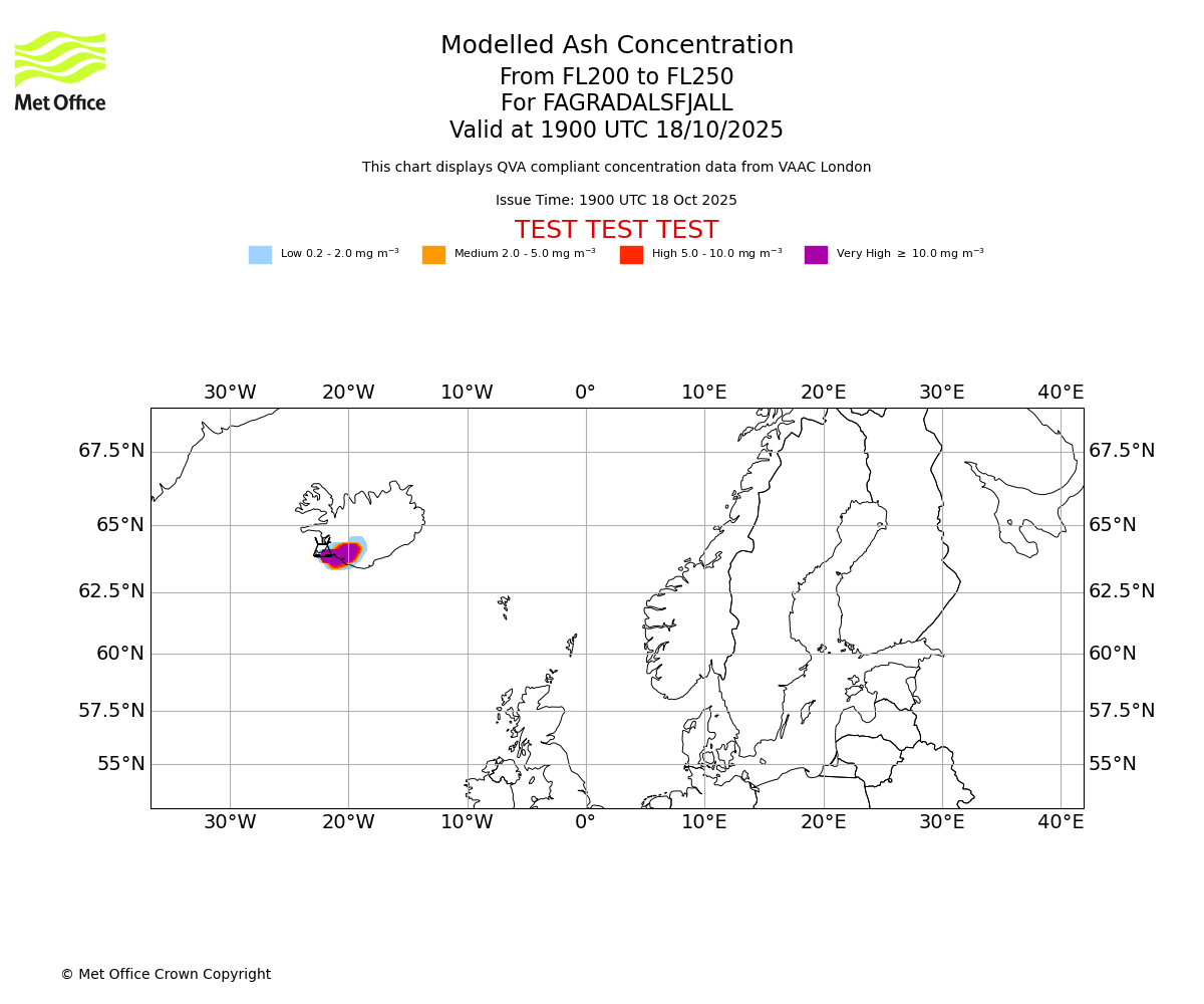 Modelled ash concentration from 000 to 200 for FAGRADALSFJALL. Valid at 1900 UTC 18/10/2025
