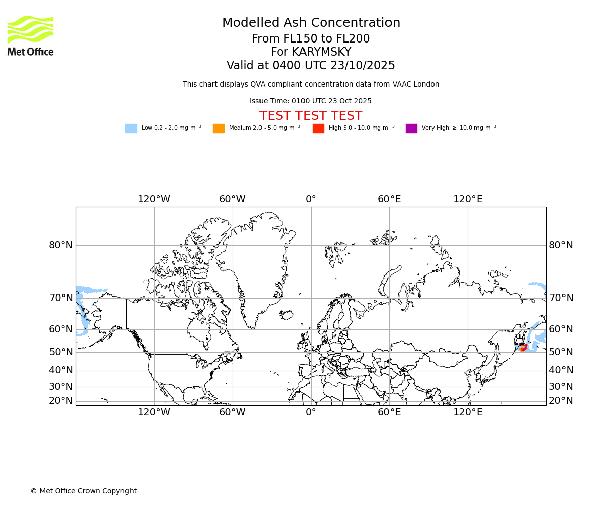 Modelled ash concentration from 150 to 200 for KARYMSKY. Valid at 0100 UTC 23/10/2025