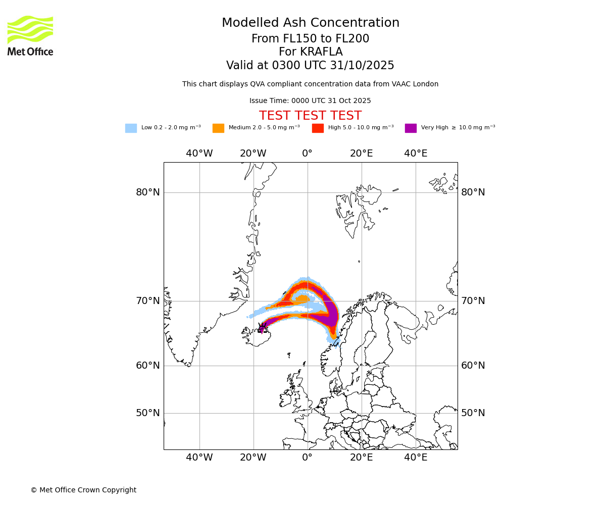 Modelled ash concentration from 150 to 200 for KRAFLA. Valid at 0000 UTC 31/10/2025