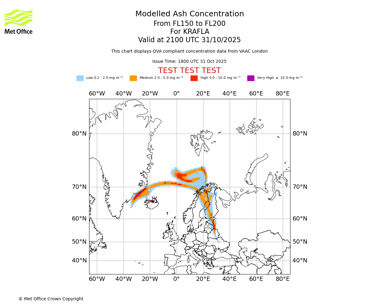 Modelled ash concentration from 150 to 200 for KRAFLA. Valid at 1800 UTC 31/10/2025