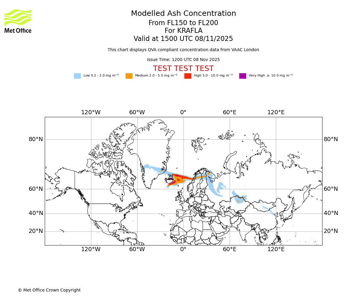 Modelled ash concentration from 150 to 200 for KRAFLA. Valid at 1200 UTC 08/11/2025