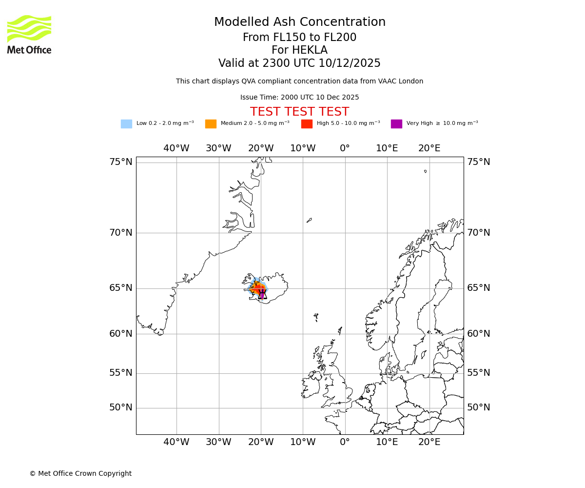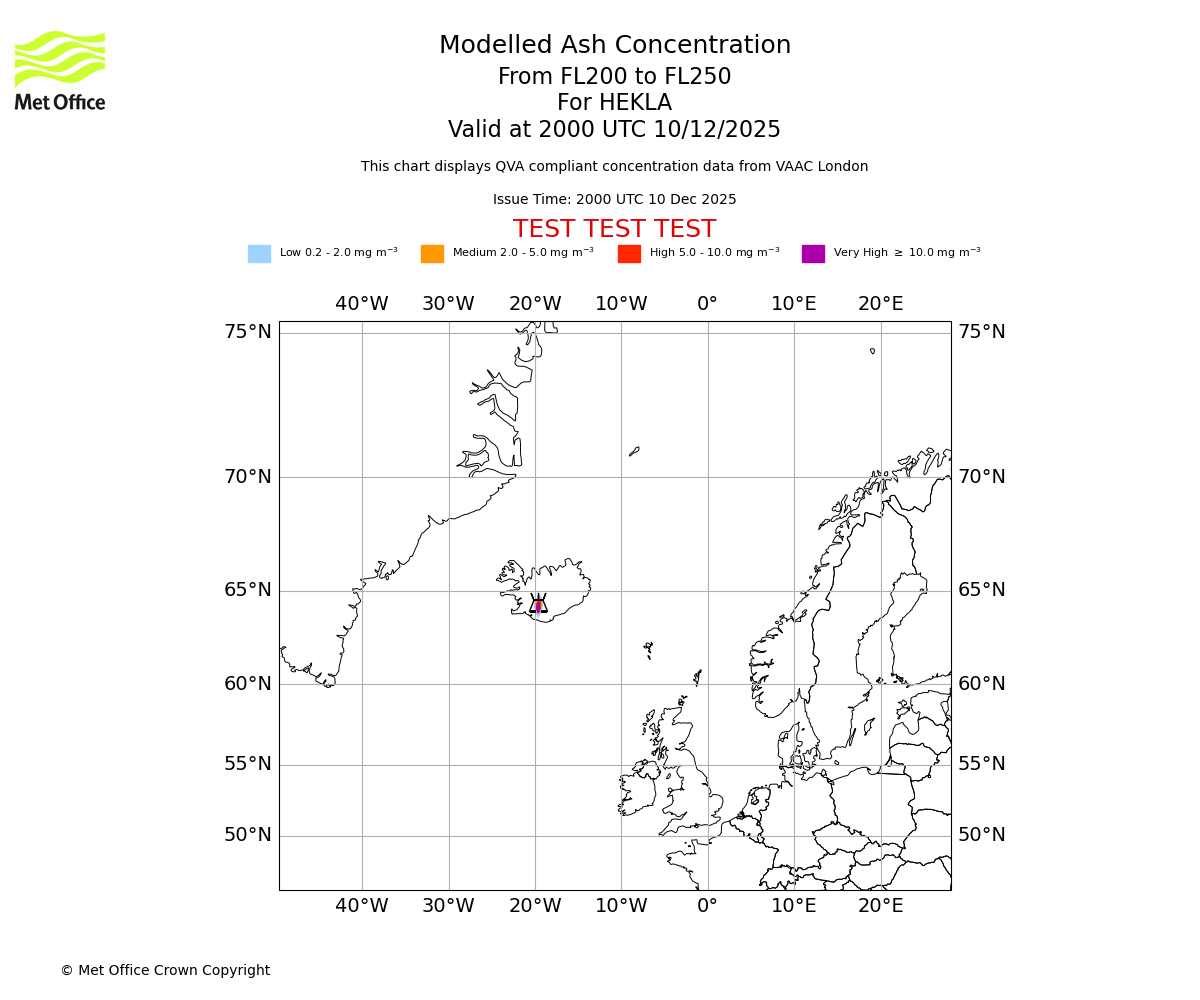 Modelled ash concentration from 150 to 200 for HEKLA. Valid at 2000 UTC 10/12/2025