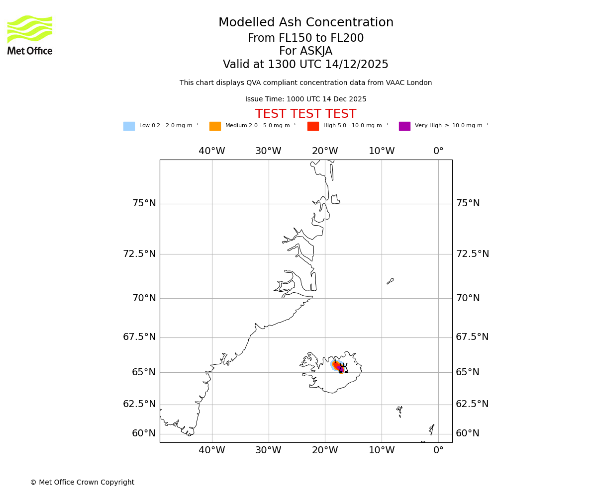 Modelled ash concentration from 150 to 200 for ASKJA. Valid at 1000 UTC 14/12/2025