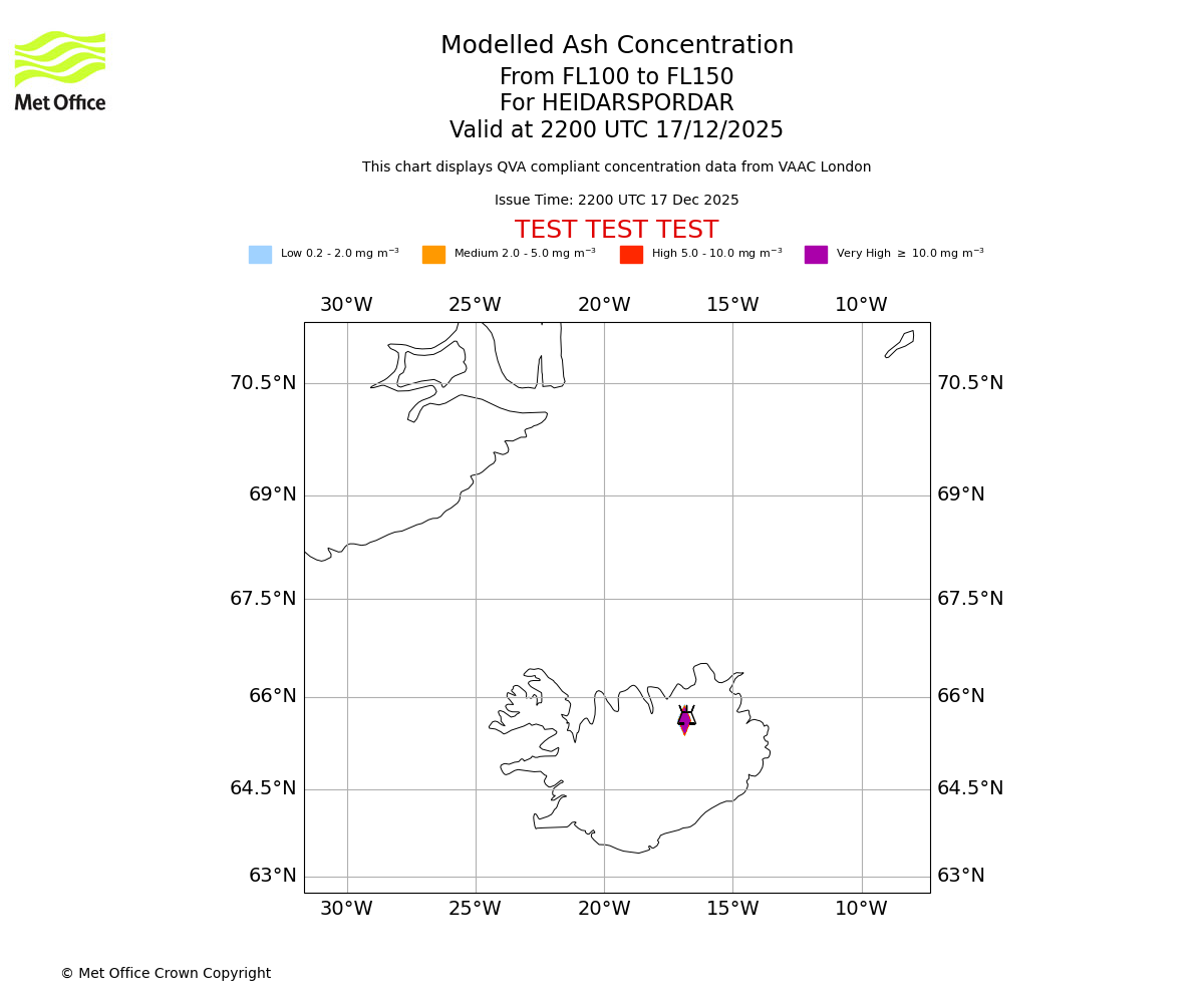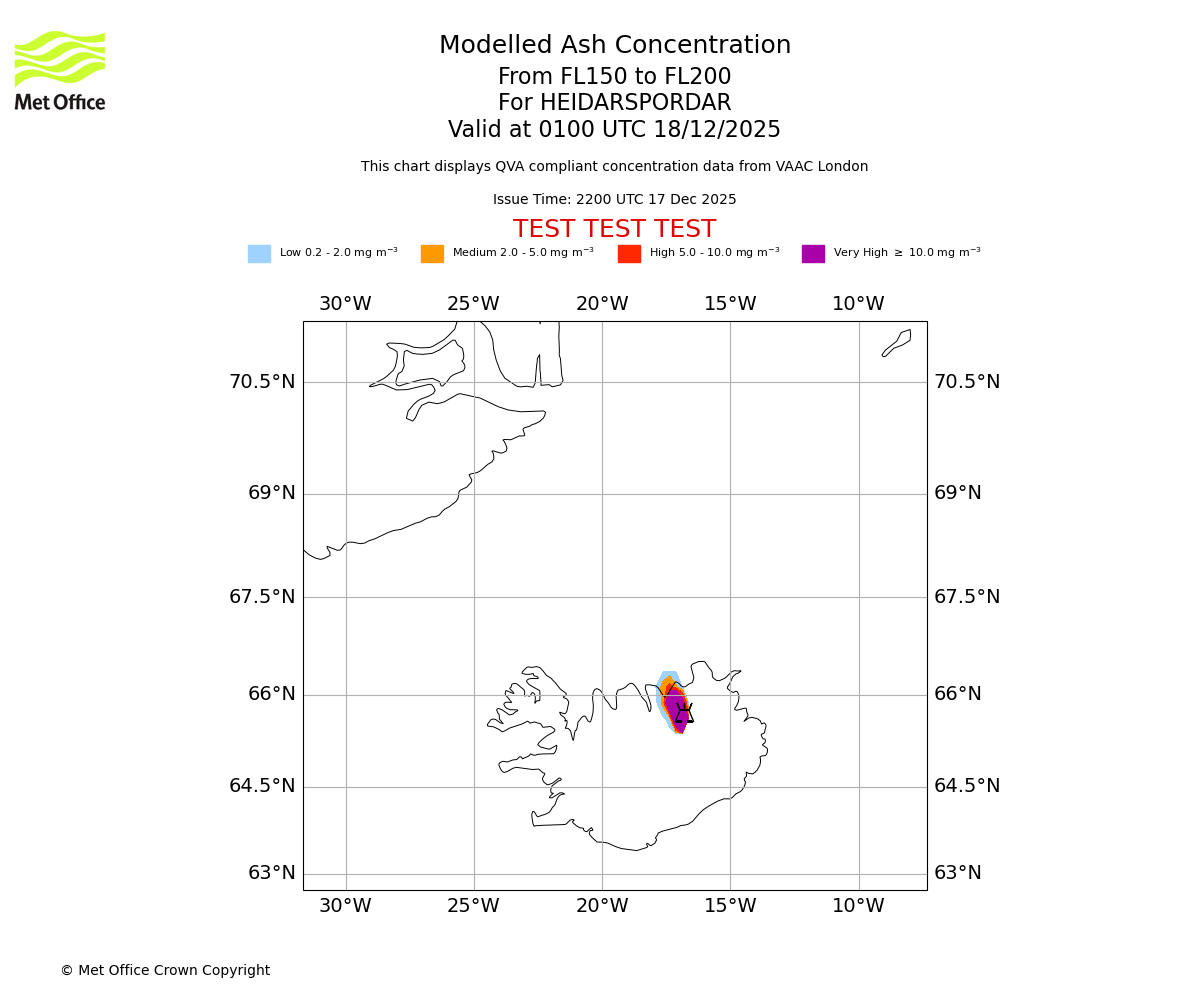 Modelled ash concentration from 150 to 200 for HEIDARSPORDAR. Valid at 2200 UTC 17/12/2025