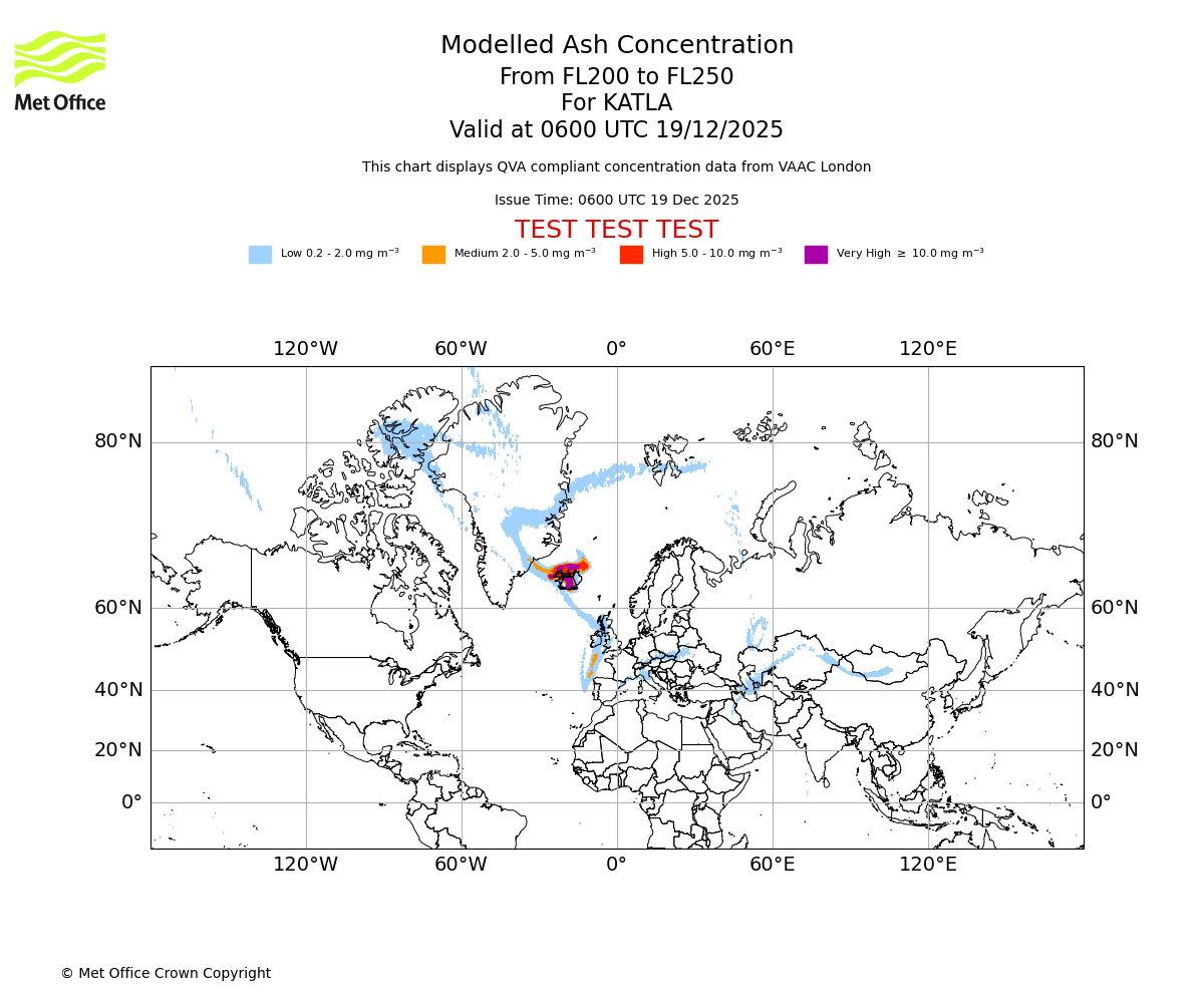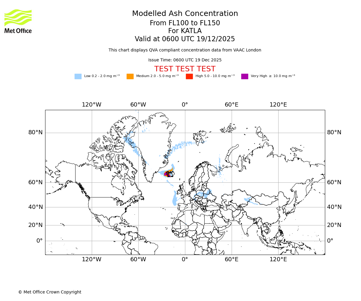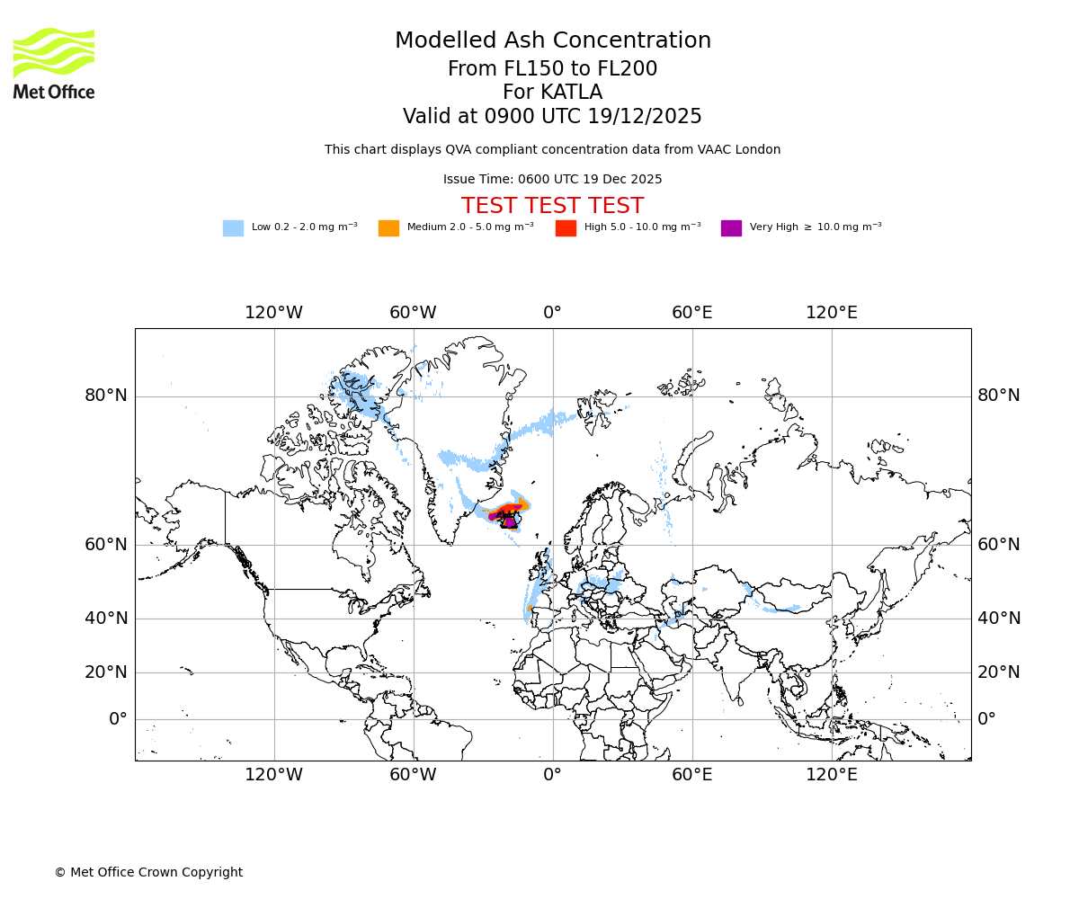 Modelled ash concentration from 150 to 200 for KATLA. Valid at 0600 UTC 19/12/2025
